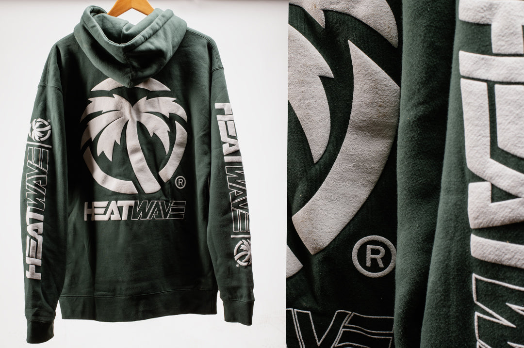 You need a good basic HEAVY hoody to fend off the unrelenting cold? Well look no further. The Heat Wave Billboard Split Sweatshirt in Alpine Green features the Billboard Split logos in 5 places printed with white puff ink on a solid HD sweatshirt.